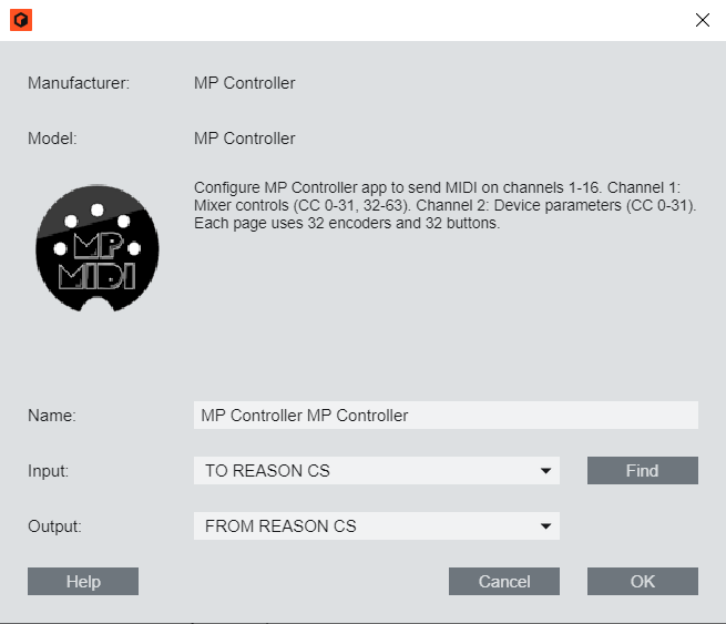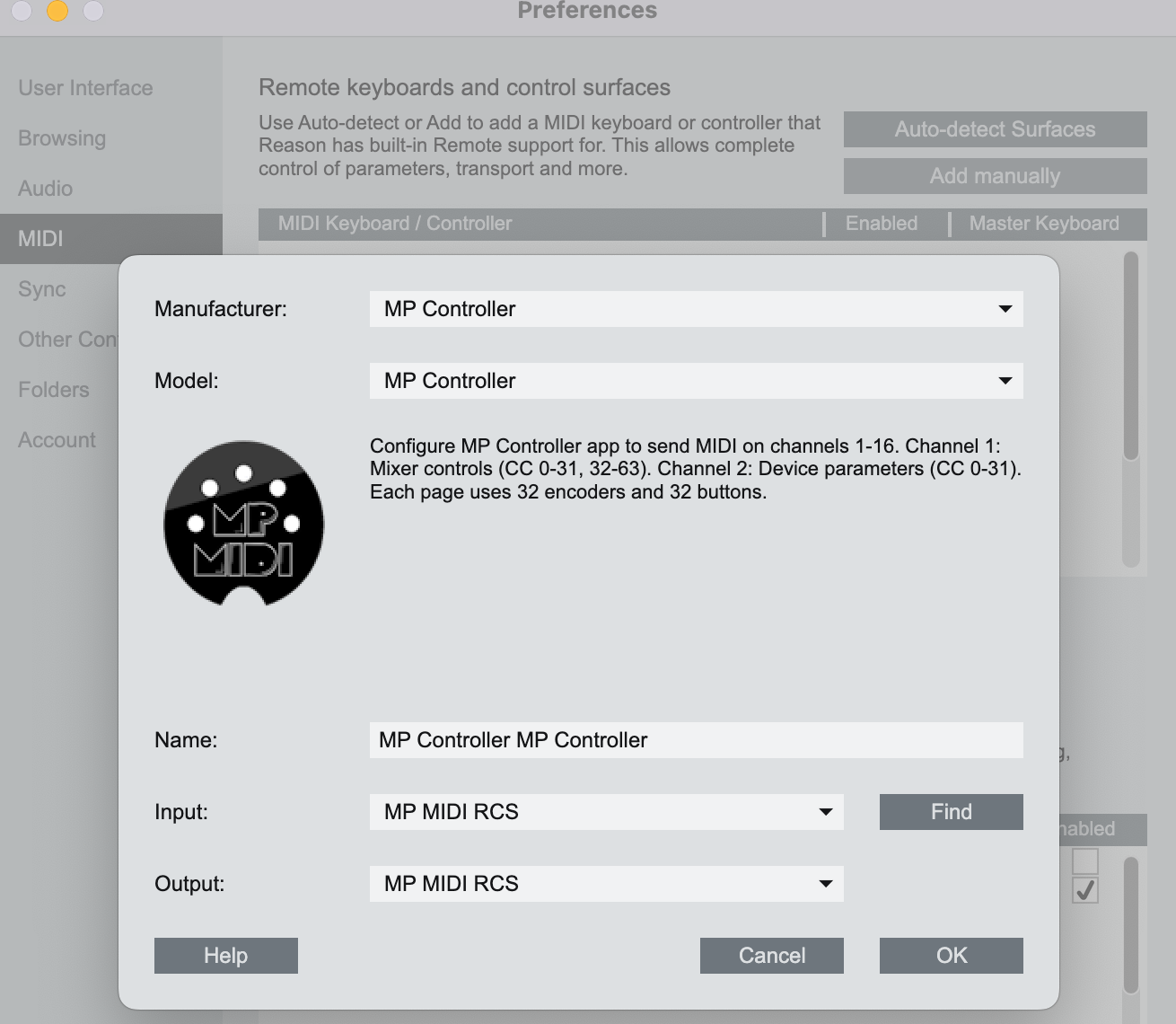 Open Reason > Preferences and add the control surface. Click on "Add Manually" and select the MP Controller and the available MIDI ports.