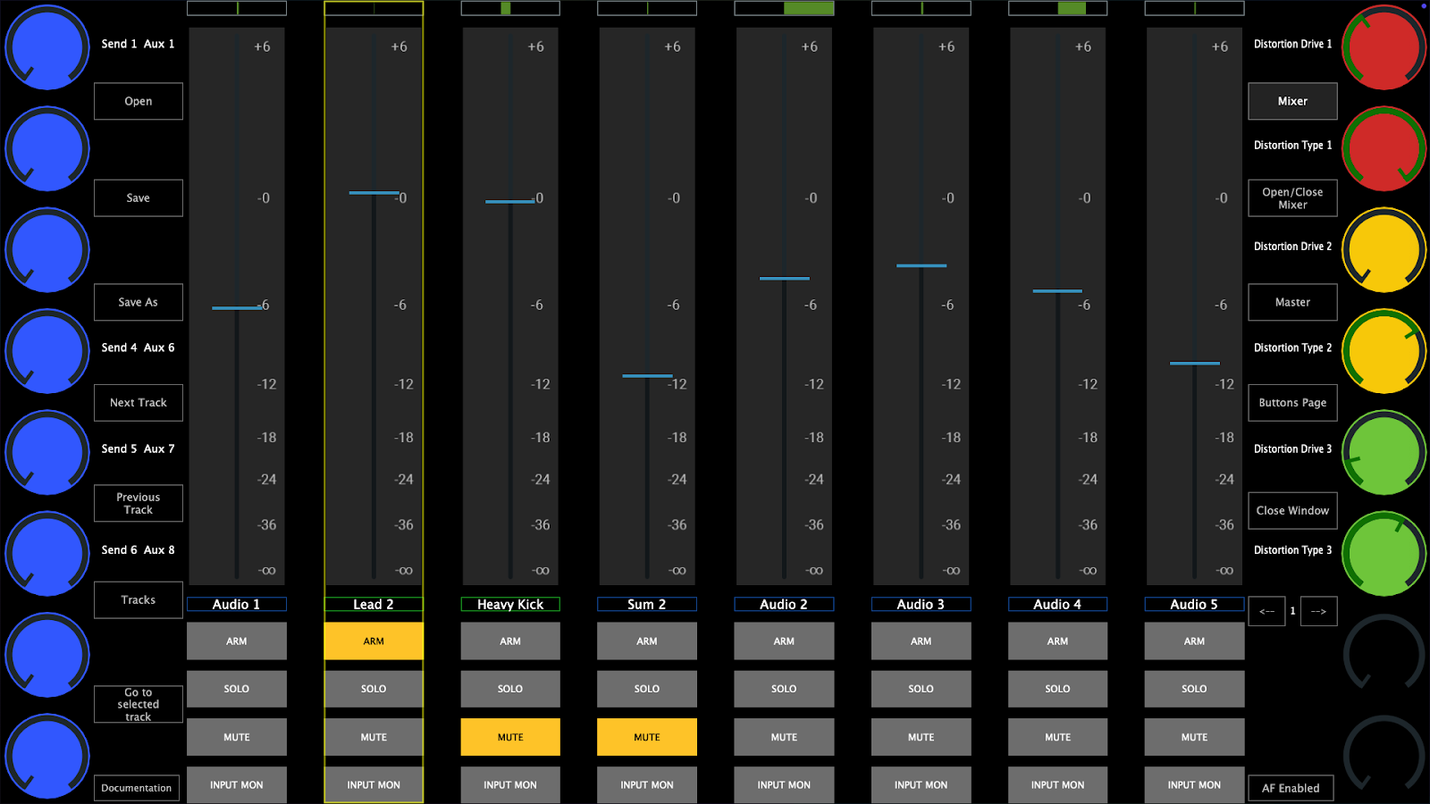 The right column of encoders control the send volumes of the selected track.