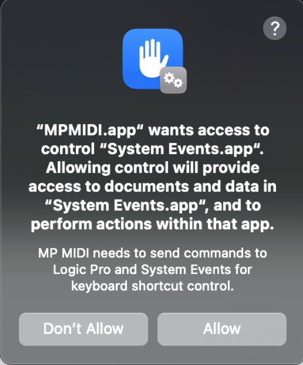 Checking the permissions needed for the MPMIDI app to send keyboard keys to Logic