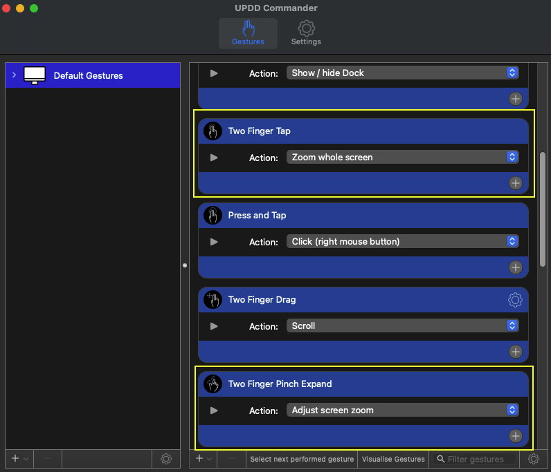 The latest version of UPDD is configured to use Zoom Screen with the 2 finger tap gesture. Zoom Screen zooms only within the controller's display. The Smart Magnifier zooms outside the controller display as well.